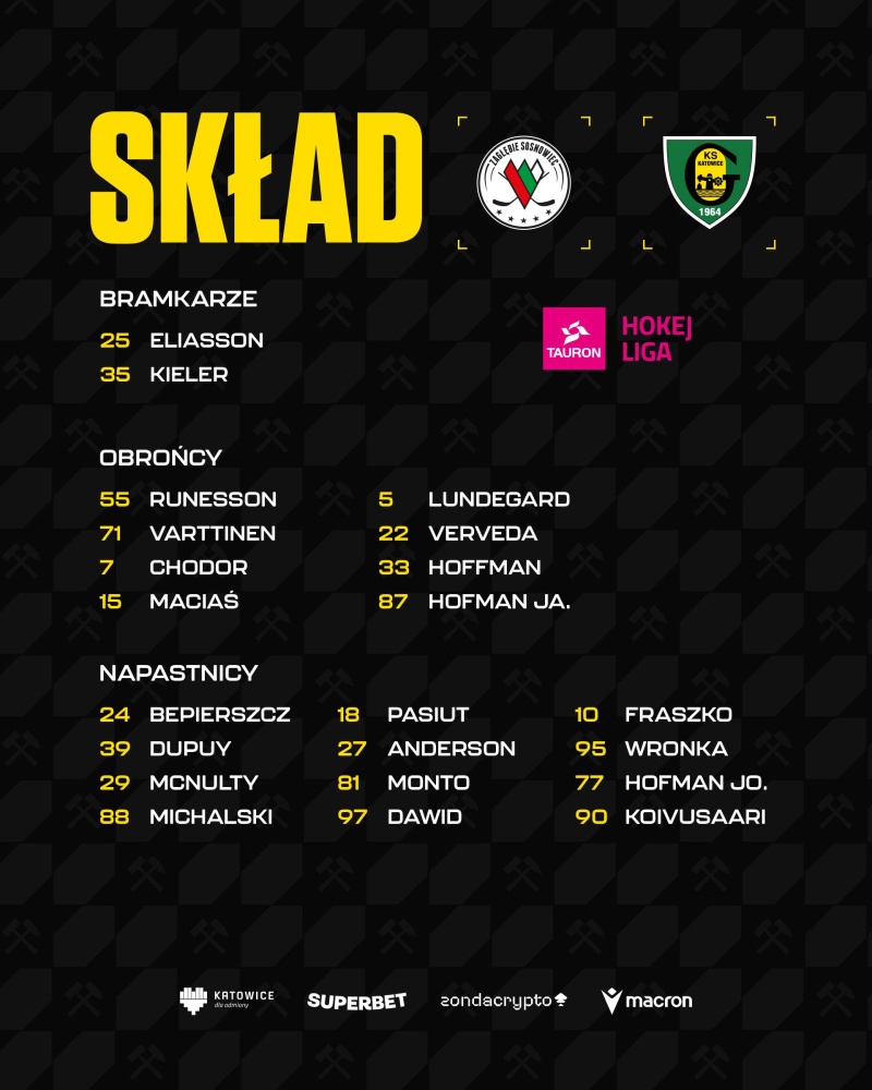 GKS Katowice: Eliasson, Kieler - Runesson, Lundegard, Bepierszcz, Pasiut, Fraszko - Varttinen, Verveda, Dupuy, Anderson, Wronka - Chodor, Hoffman, McNulty, Monto, Hofman Jo. - Maciaś, Hofman Ja., Michalski, Dawid, Koivusaari. Trener: Jacek Płachta