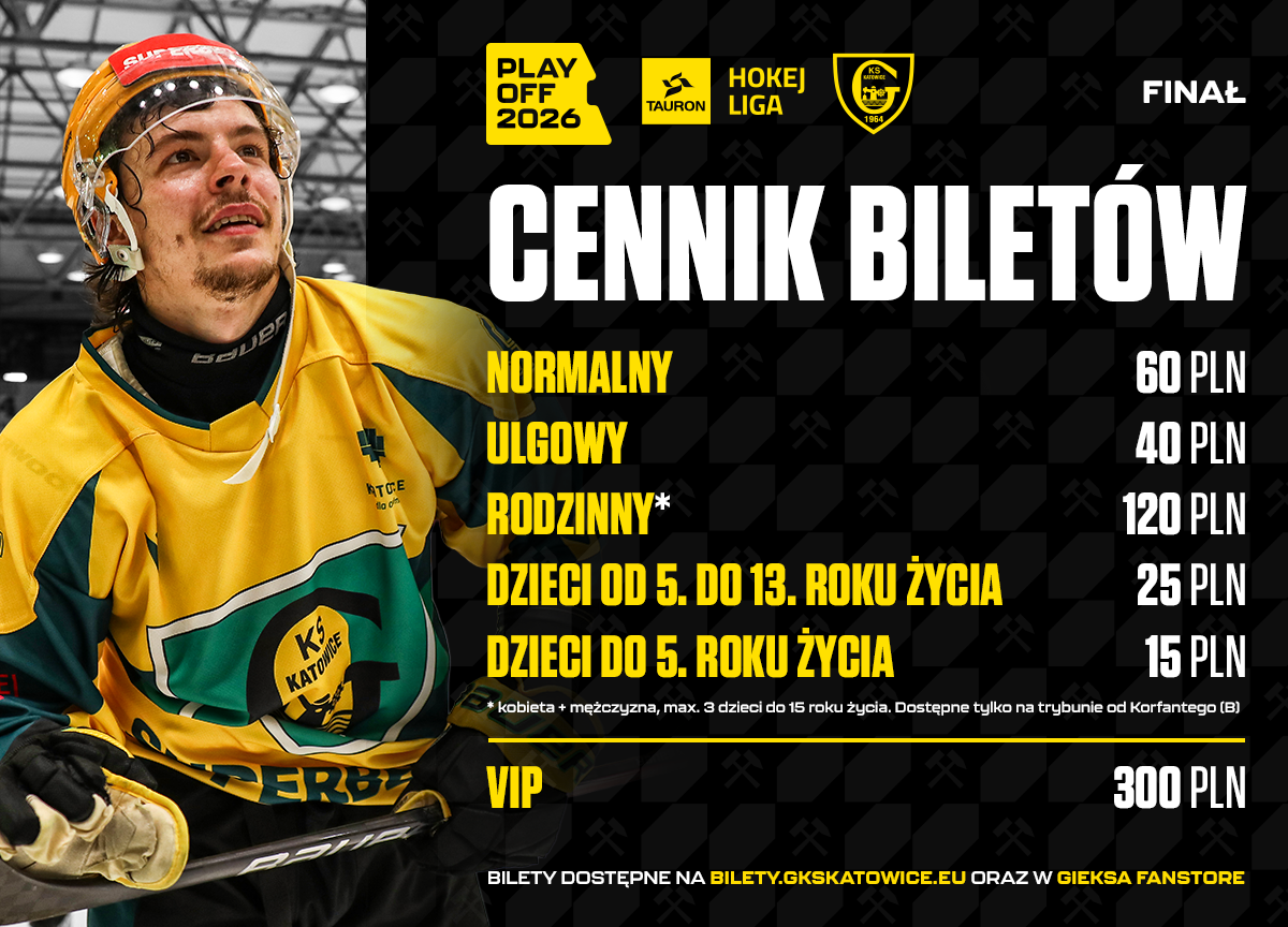 GKS Katowice będzie rywalizował z GKS-em Tychy o złote medale mistrzostw Polski. Pierwsza dwa mecze finałów THL odbędą się w „Satelicie” (1 kwietnia o godz. 18:00, 2 kwietnia o godz. 20:30). Zachęcamy do zakupu biletów na te spotkania. Ceny wejściówek wynoszą: 60 zł (normalny), 40 zł (ulgowy), 120 zł (rodzinny), 25 zł (dzieci w wieku 5-13 lat), 15 zł (dzieci od lat 5) oraz 300 zł (VIP).